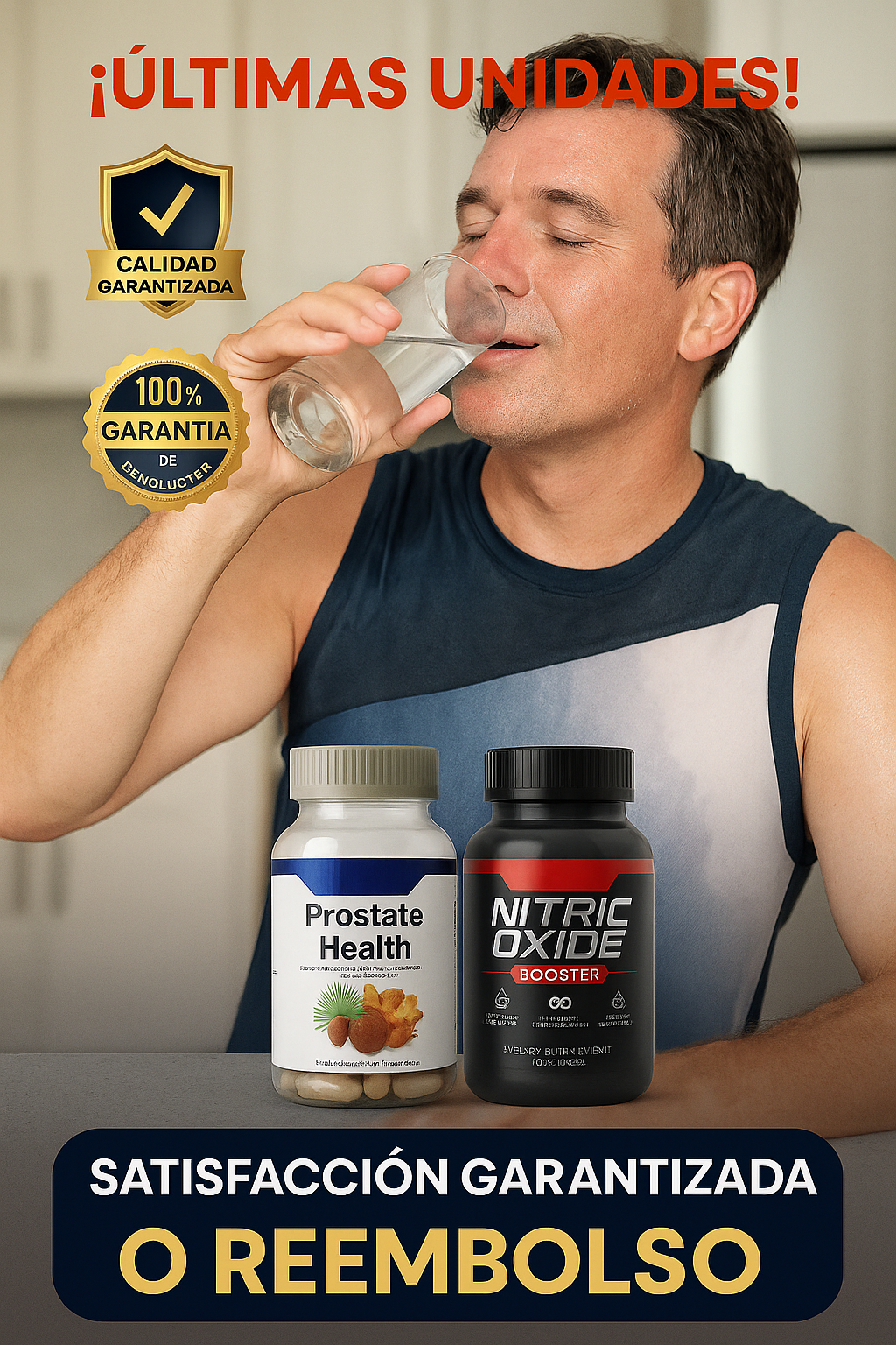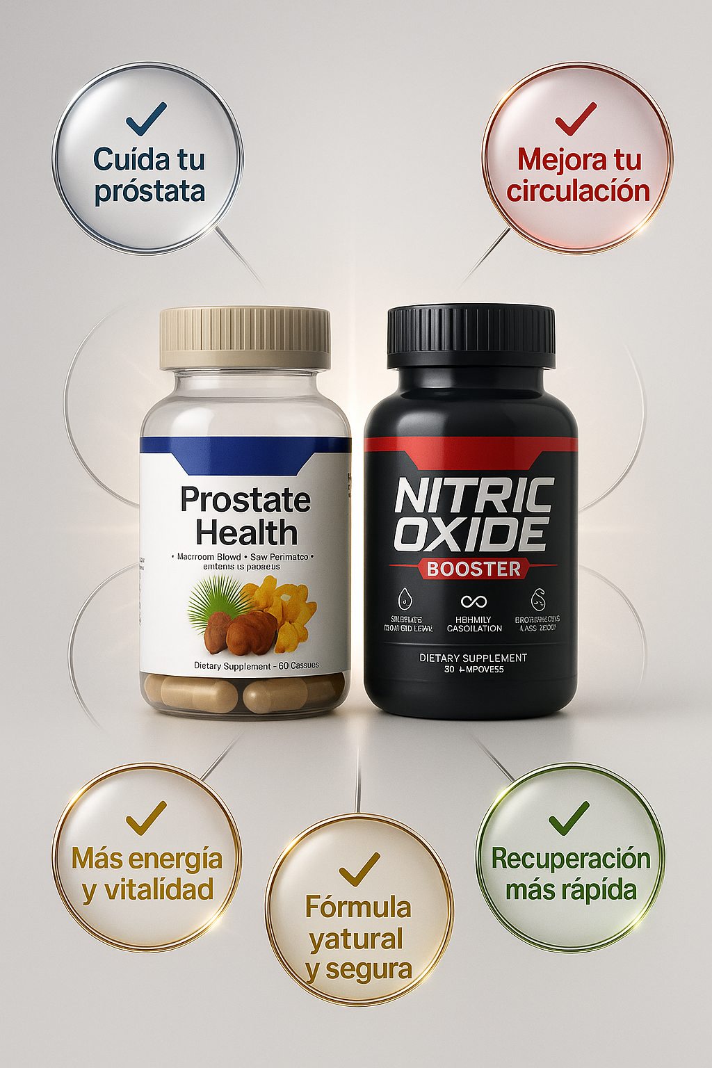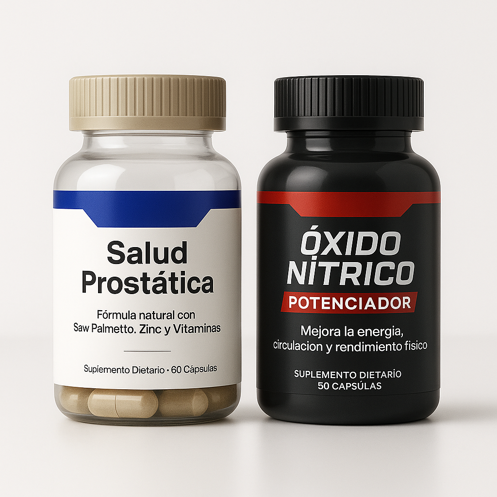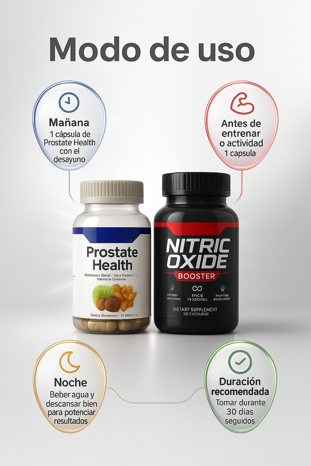 Prostate Health protege la próstata y regula la función urinaria; Nitric Oxide mejora la circulación y la oxigenación muscular. Juntos te dan salud + energía.